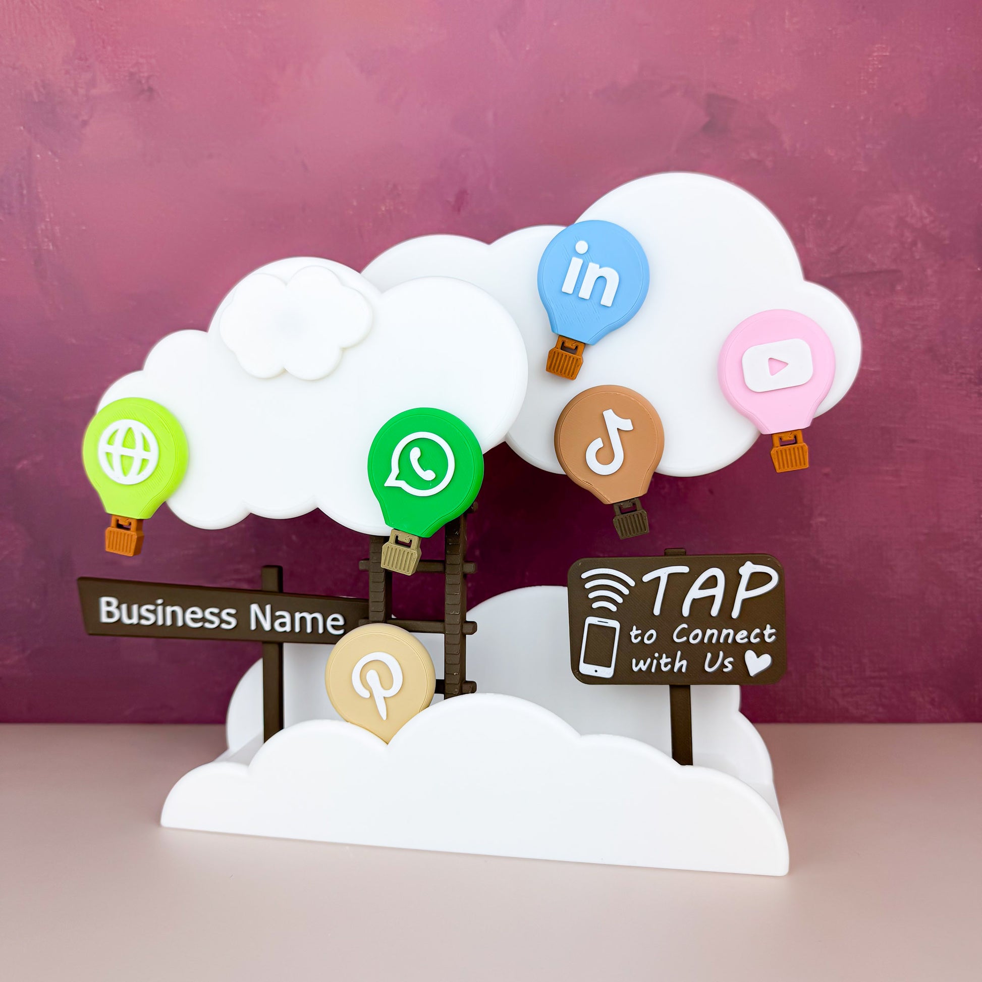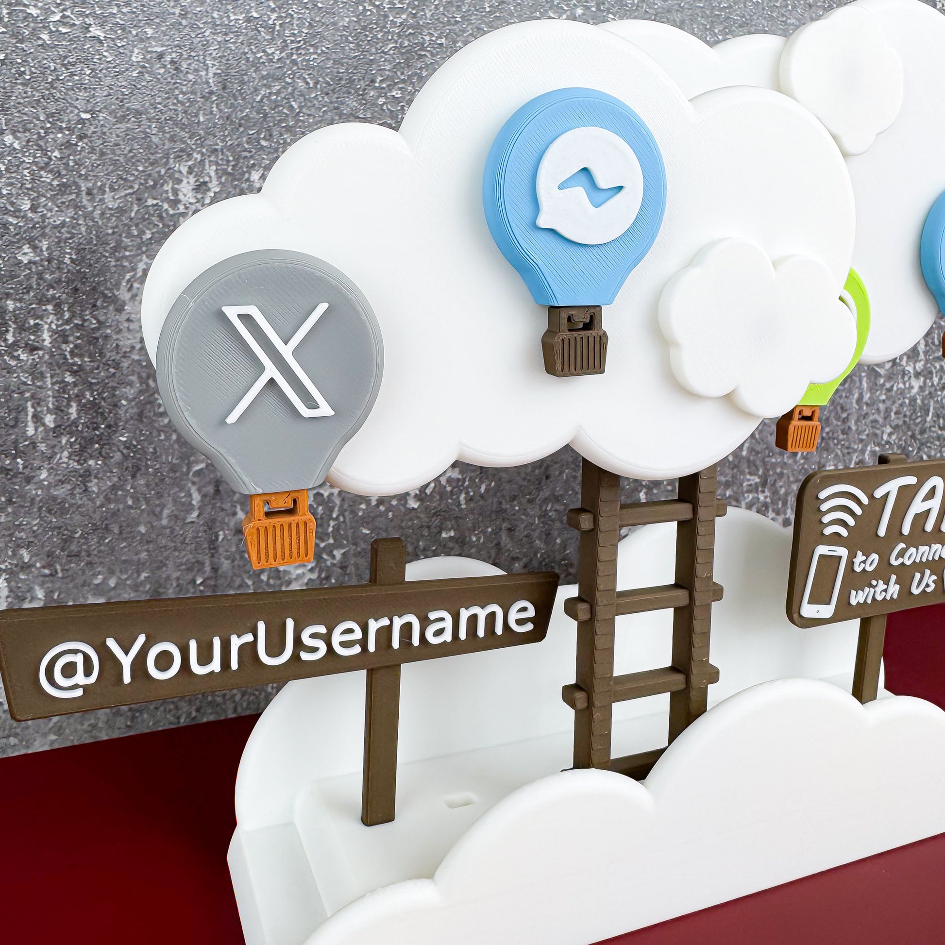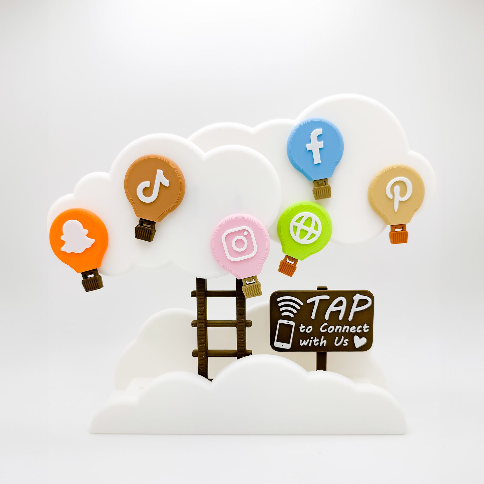 - Up to 6 NFC tags of your choice in the shape of colorful hot air balloons, perfect for creators, influencers, or businesses. Select from: Instagram, TikTok, Pinterest, SnapChat, Facebook, Website, Thread, WhatsApp, LinkedIn, Discord, X, Messenger, Twitch, and YouTube.