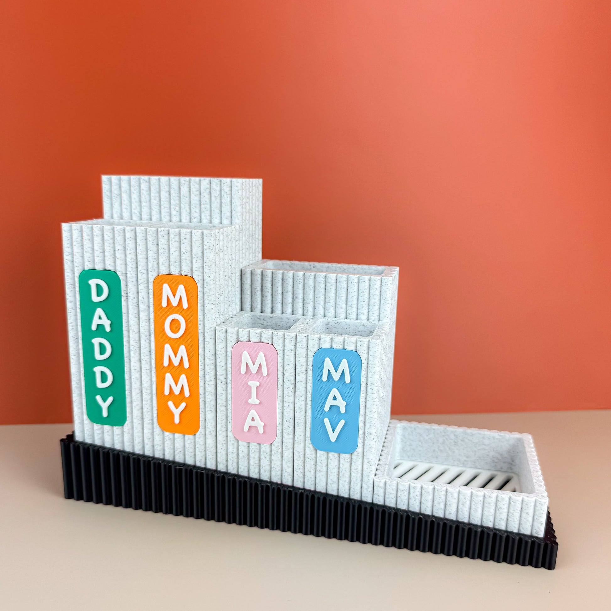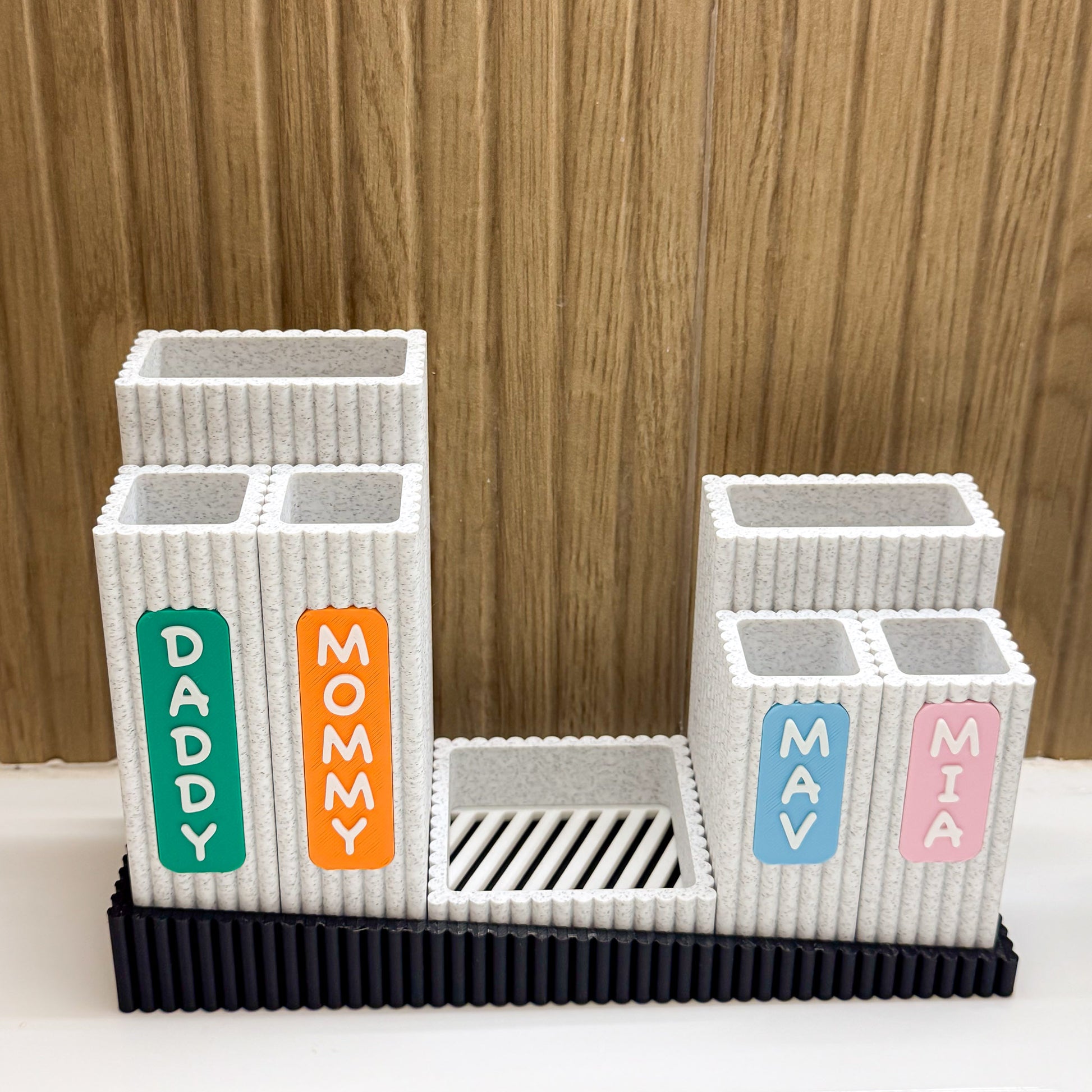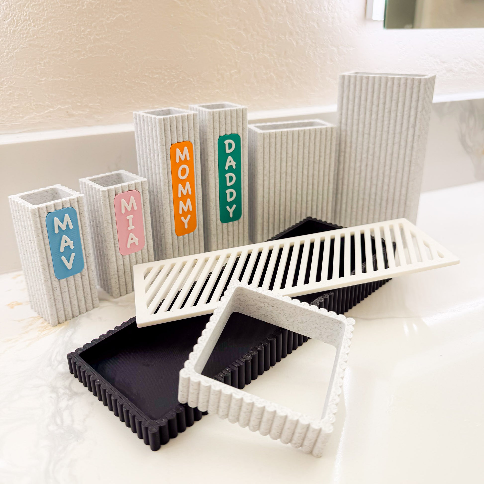 Meet Nestle, your personalized bathroom organizer to keep your counter tidy and clean. Designed for families, this organizer features labeled compartments for each member—making morning and bedtime routines simpler and more fun. The stylish ribbed containers can be arranged to suit your needs, while a removable drip tray helps catch excess water and keep your items dry. As a bonus, the toothbrush containers can be personalized with your preferred text.