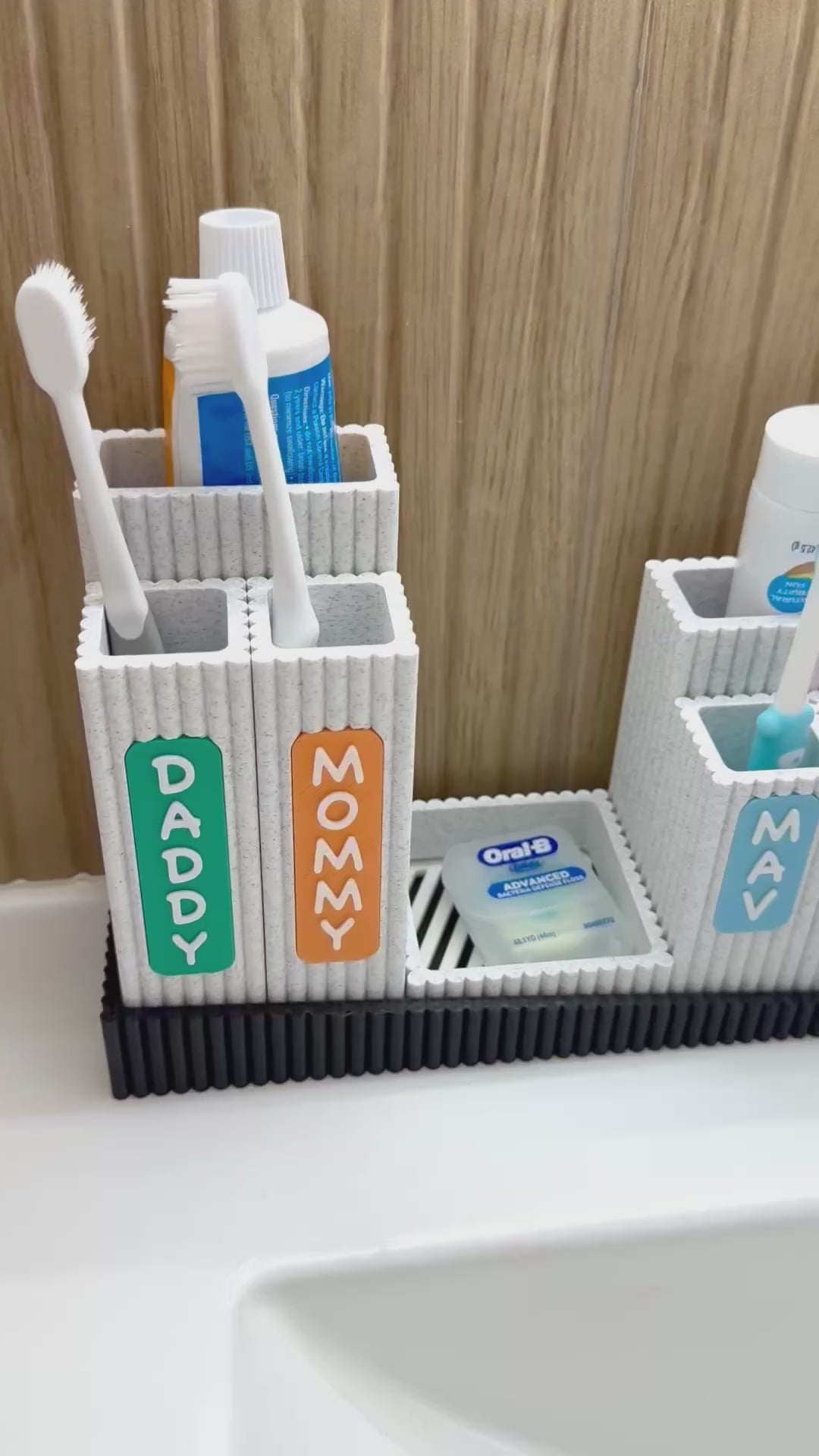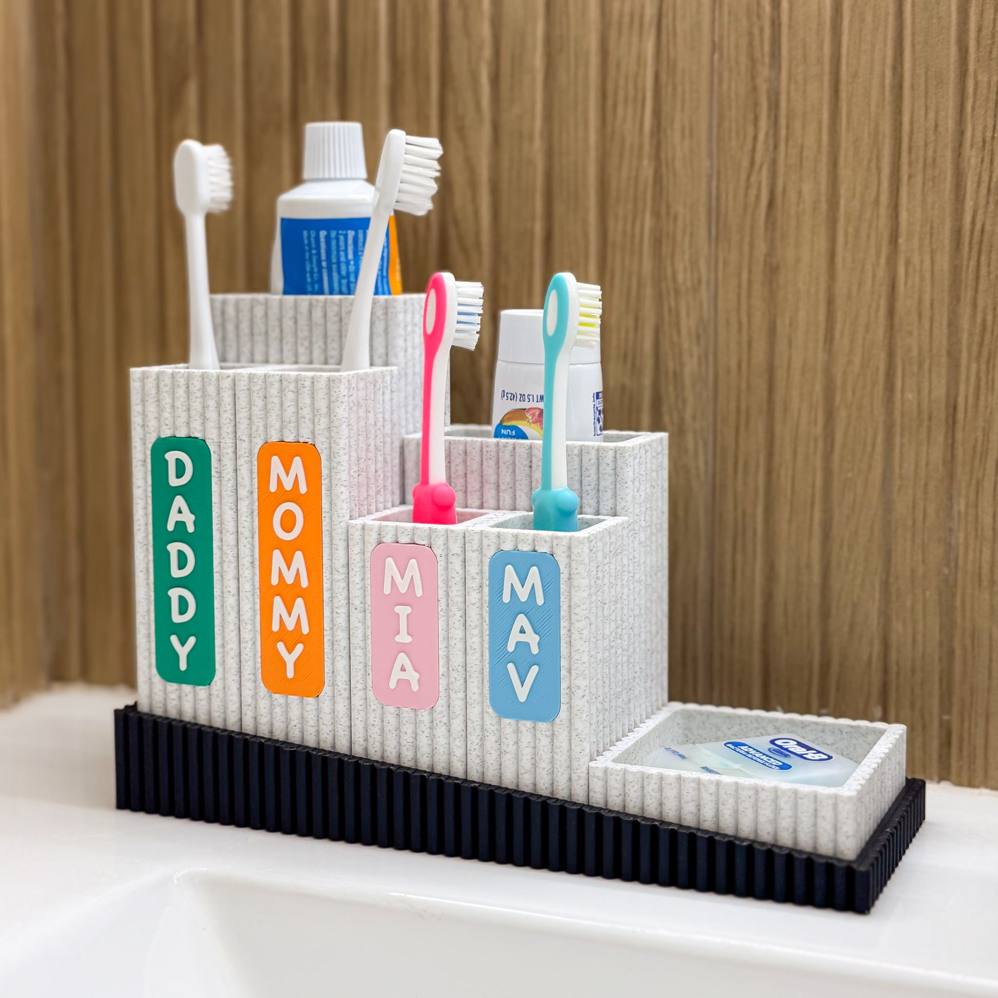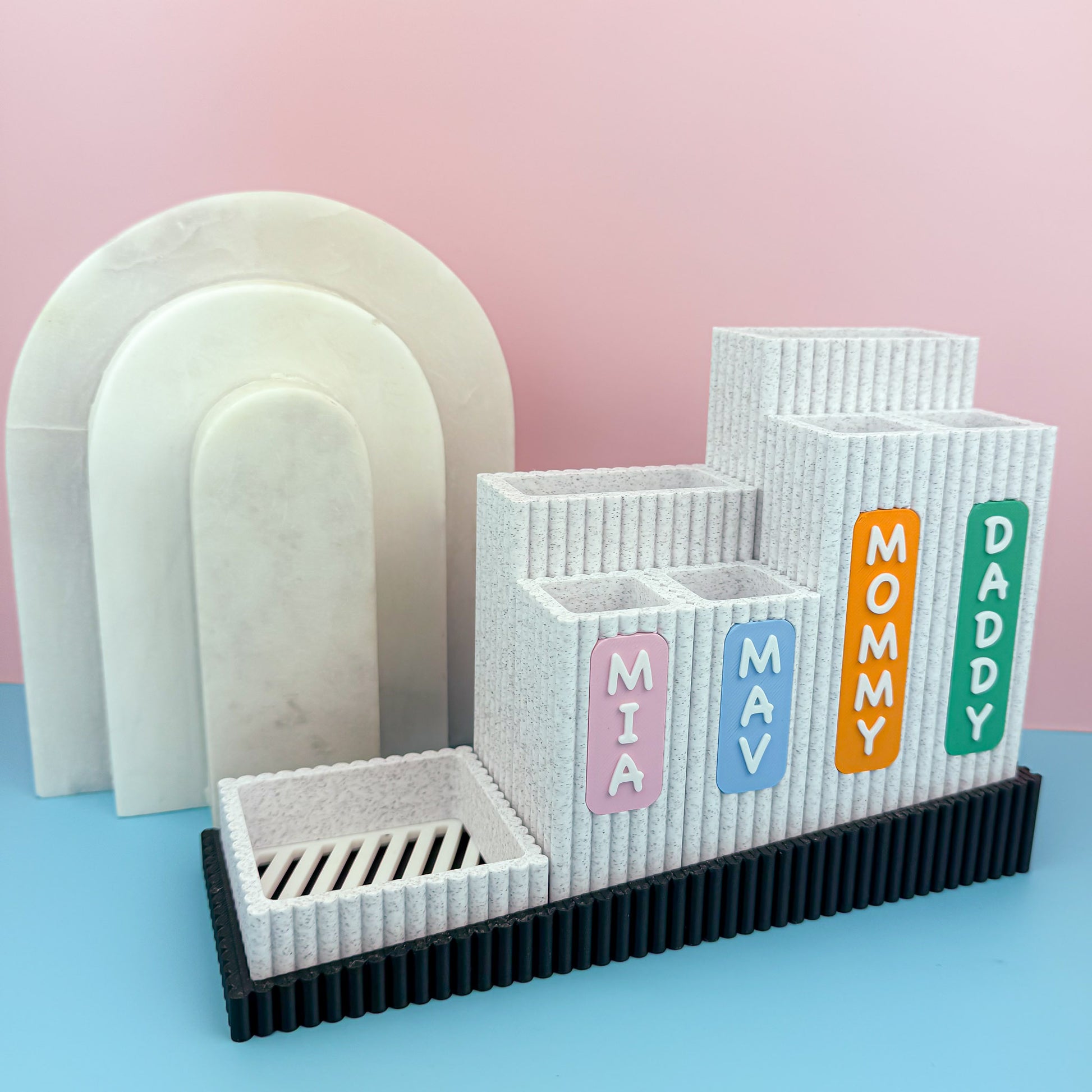 Meet Nestle, your personalized bathroom organizer to keep your counter tidy and clean. Designed for families, this organizer features labeled compartments for each member—making morning and bedtime routines simpler and more fun. The stylish ribbed containers can be arranged to suit your needs, while a removable drip tray helps catch excess water and keep your items dry. As a bonus, the toothbrush containers can be personalized with your preferred text.